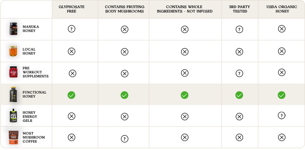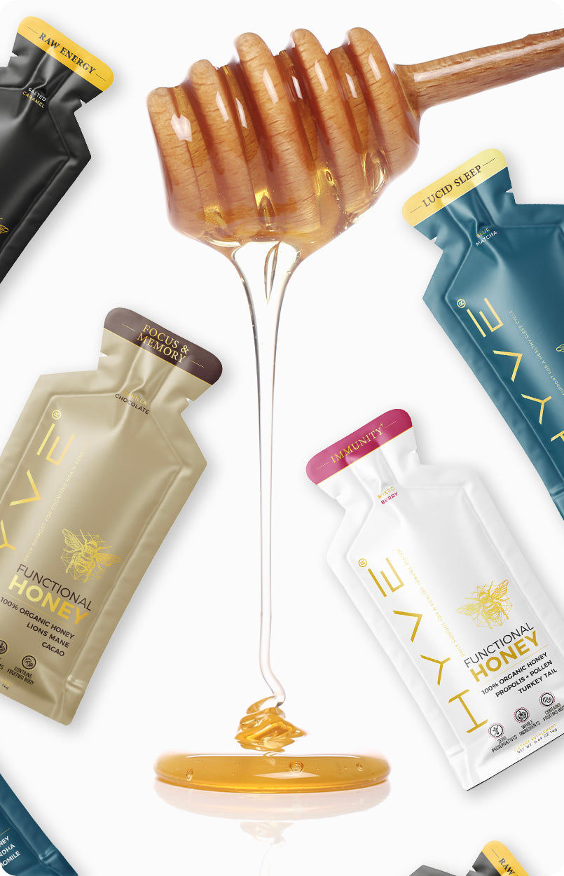 Our Functional Honey formulations are meticulously crafted using proprietary methods and gently blended to a silky smooth texture that melts in your mouth. We only use whole ingredients,Β NEVERΒ infused!